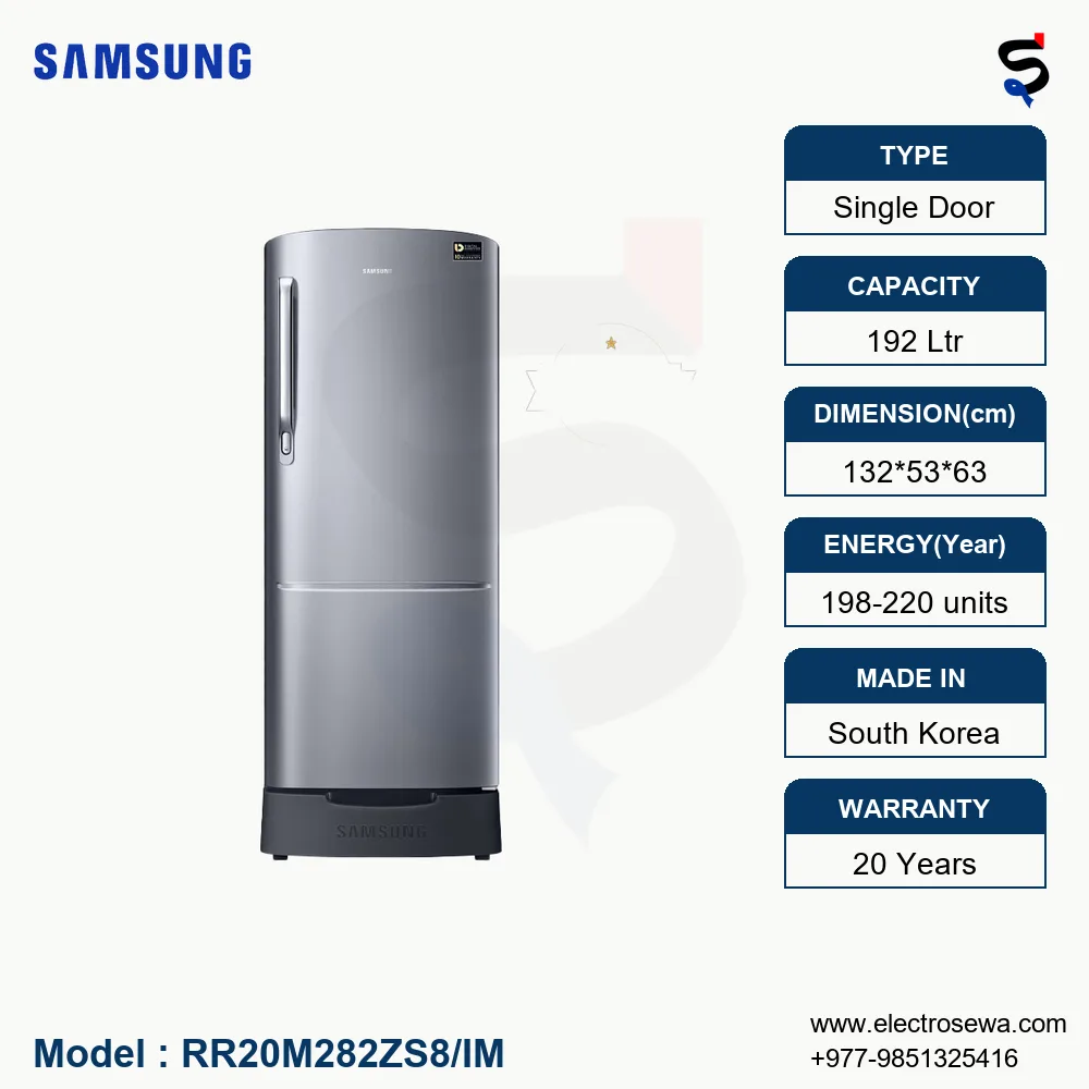 The SAMSUNG Refrigerator – 192 Ltr Single Door (RR20M282ZS8/IM) is the perfect addition to your kitchen, delivering a perfect balance of style, efficiency, and practicality. With a capacity of 192 liters, this 192 ltr Samsung refrigerator is designed to meet the diverse needs of modern households, making it an ideal choice for small families, singles, or anyone looking to maximize storage space without compromising on quality or functionality.