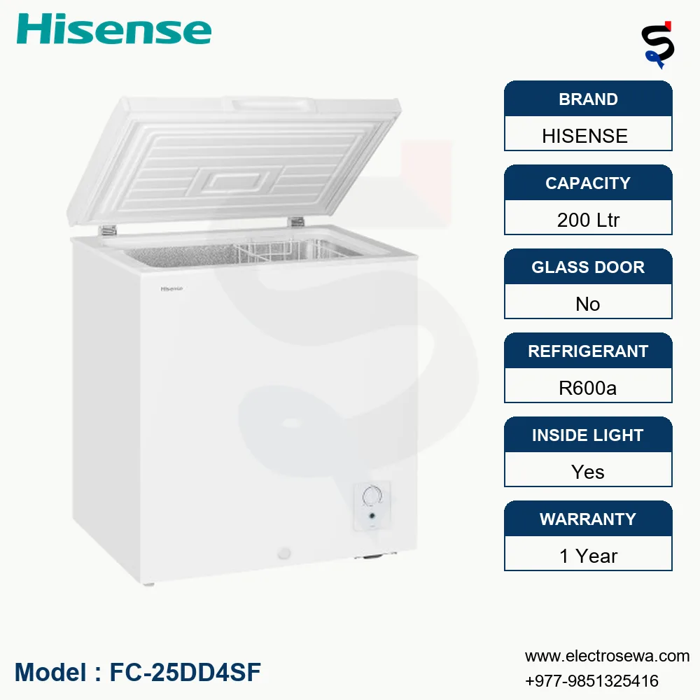 The HISENSE Chest Freezer 200 Ltr Hard Top Sliding Glass (FC-25DD4SF) is a premium choice for anyone in need of reliable and spacious frozen storage. Available at Electrosewa in Nepal at the best price, this chest freezer combines advanced technology with user-friendly features, making it ideal for both domestic and commercial use. With its ample capacity and efficient performance, the HISENSE chest freezer is designed to keep your food items fresh and well-preserved for extended periods.