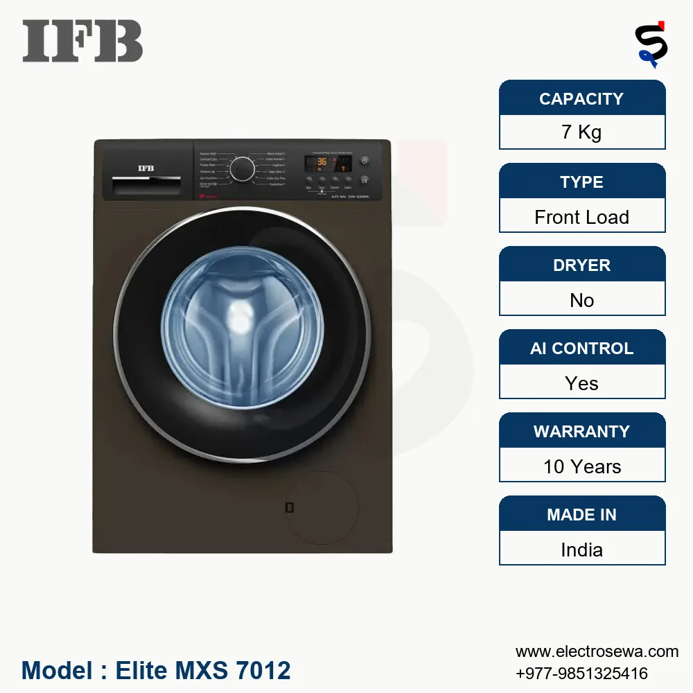 In summary, the IFB 7 Kg Washing Machine Front Loading Digital Steam (ELITE MXS) is a remarkable appliance that offers a perfect blend of advanced technology, efficiency, and user-friendly features. Its innovative steam function, energy efficiency, quiet operation, and robust build make it an ideal choice for modern households. Available at Electrosewa, this washing machine not only meets your laundry needs but also enhances your lifestyle by providing a convenient and effective solution for all your washing requirements.