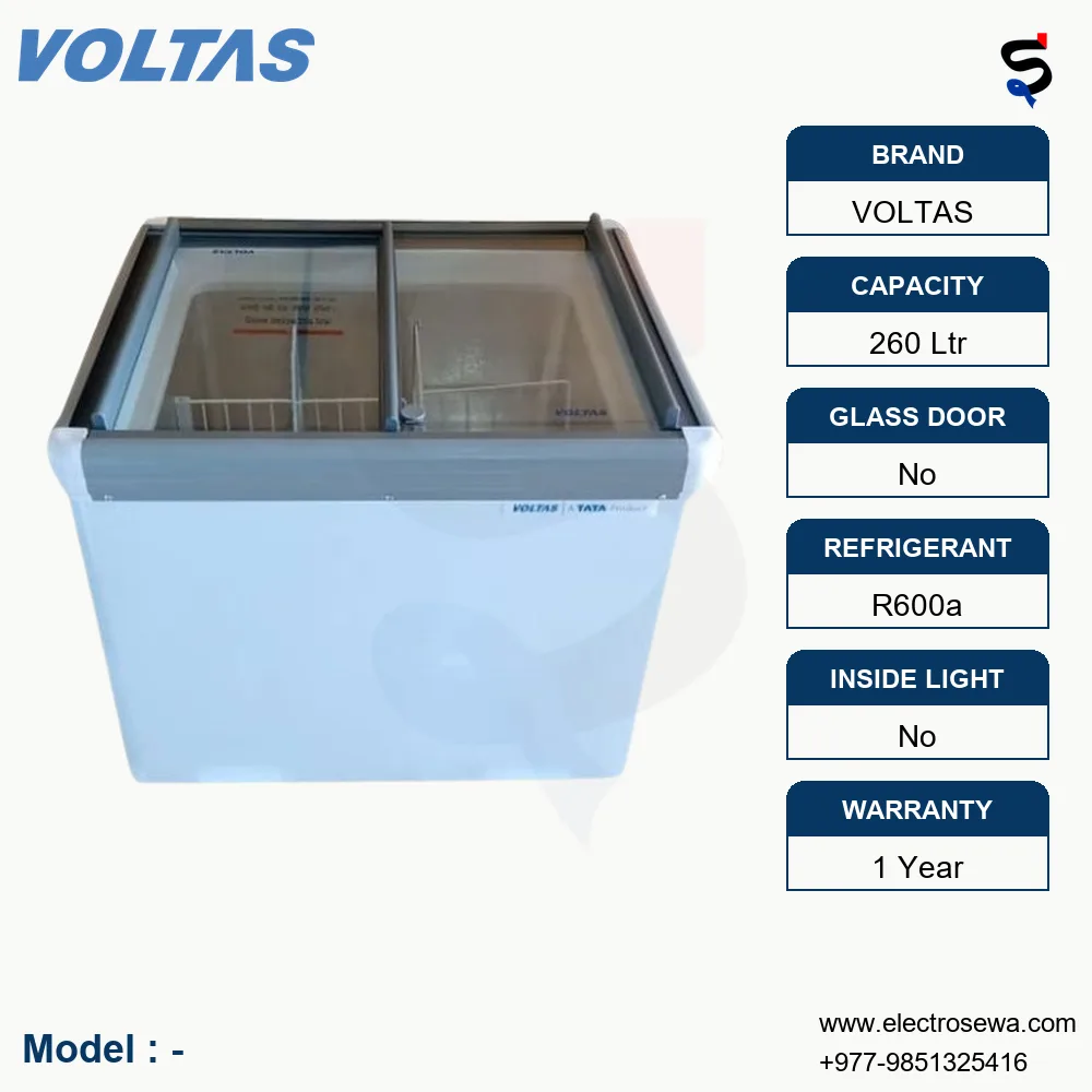 Introducing the VOLTAS Glass Sliding Chest Freezer—a perfect blend of efficiency, capacity, and convenience, now available at Electrosewa in Nepal at the best price. Designed to meet both household and commercial refrigeration needs, this chest freezer offers ample storage space with an innovative glass sliding door for easy access and visibility. With advanced cooling technology, durable construction, and energy-efficient performance, the Voltas 260 Ltr chest freezer ensures your perishables are preserved under optimal conditions for extended periods.
