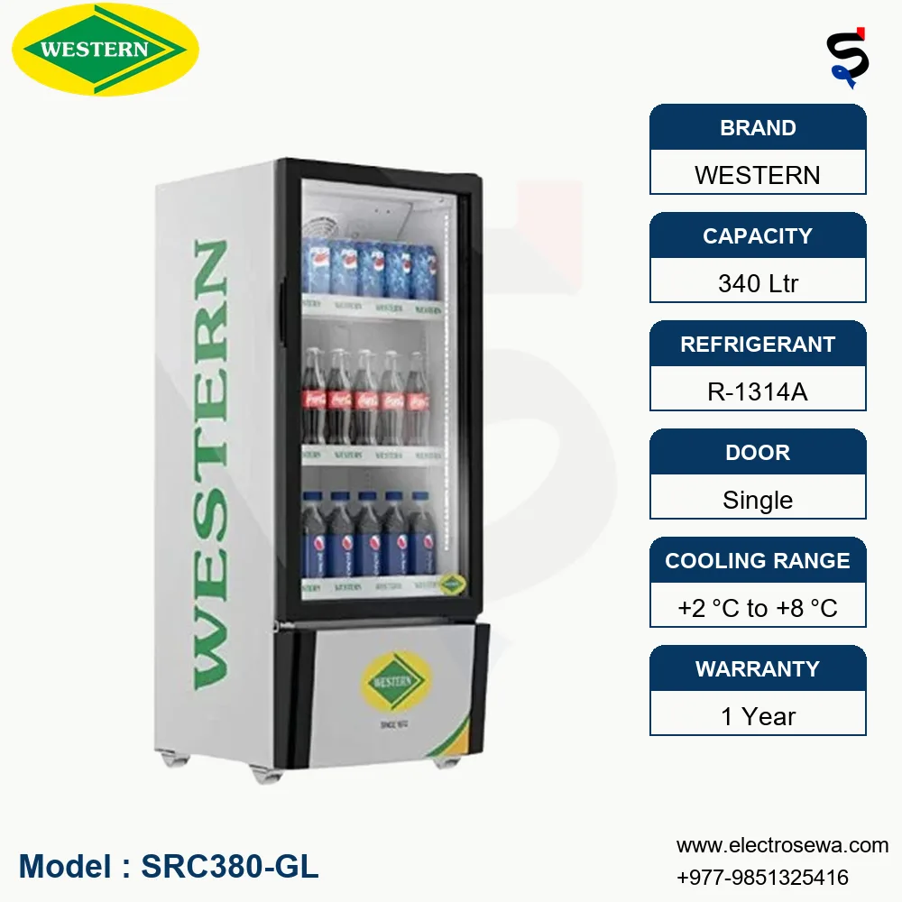 The WESTERN Visi Cooler 340 ltr SRC380-GL is a high-capacity 340-liter commercial refrigeration unit designed to keep beverages perfectly chilled while showcasing them behind a sleek vertical glass door. Ideal for retail stores, supermarkets, bars, and restaurants, this chiller combines efficient cooling with an attractive display to boost sales and customer convenience.